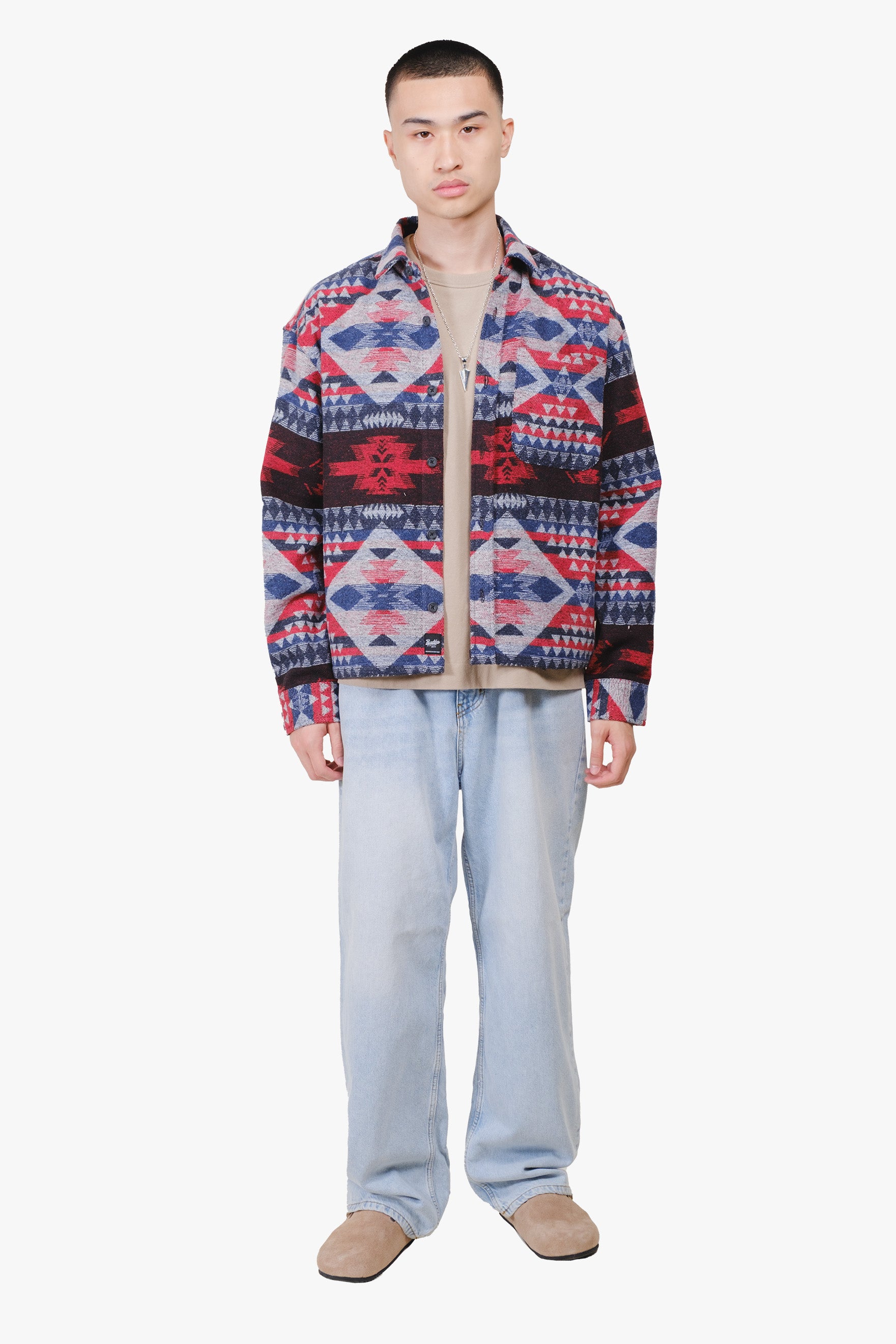 Pattern that pops. Comfort that lasts. The Boxy Native Diamond Stripe Jacquard Shacket takes classic Southwestern inspiration and flips it into a bold streetwear statement. Woven with a custom jacquard diamond stripe pattern, this piece brings rich texture and standout detail. The boxy fit and dropped shoulders give it that relaxed, vintage feel, perfect for layering over hoodies or tees.